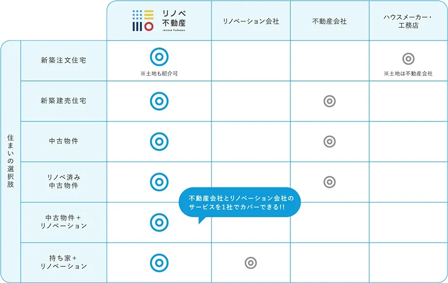 リノベ不動産では中古戸建て・中古マンション+リノベーションをメインとしていますが、それ以外の選択肢も用意しています。