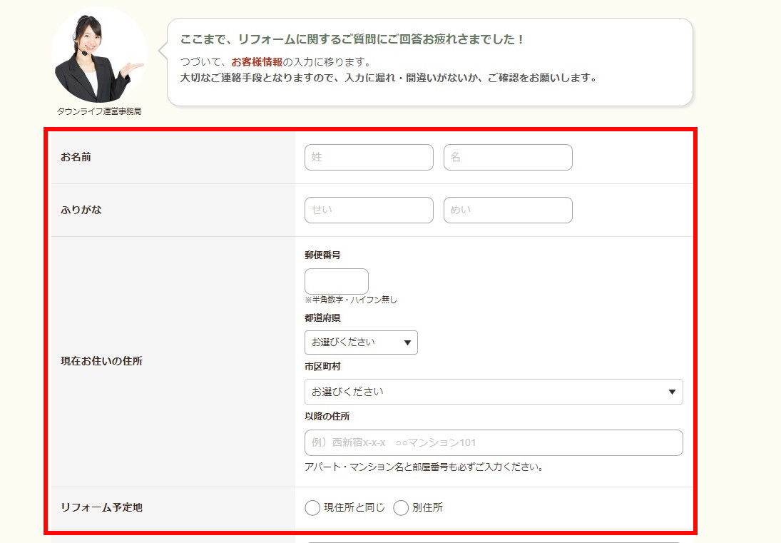 氏名/ふりがな/現在お住いの住所/リフォーム予定地/E-MAILアドレス/電話番号 を入力する