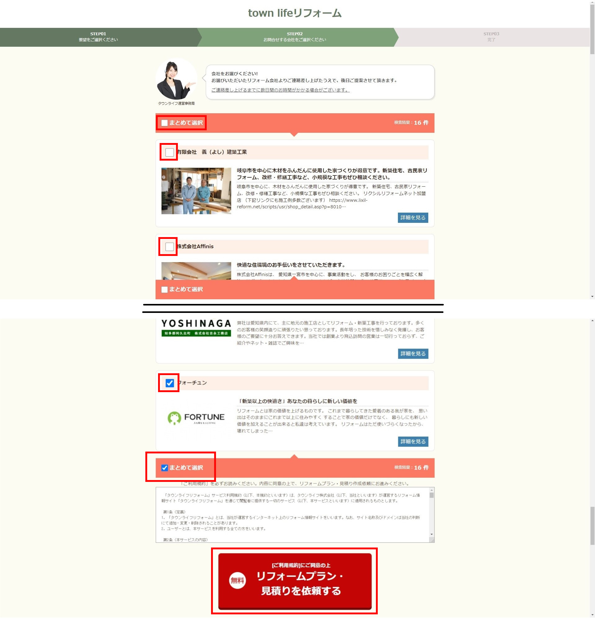 紹介可能なリフォーム会社が出てきますので、見積もり依頼したい会社をチェックしてください。まとめて選択にチェックすると出ている全社に依頼できます