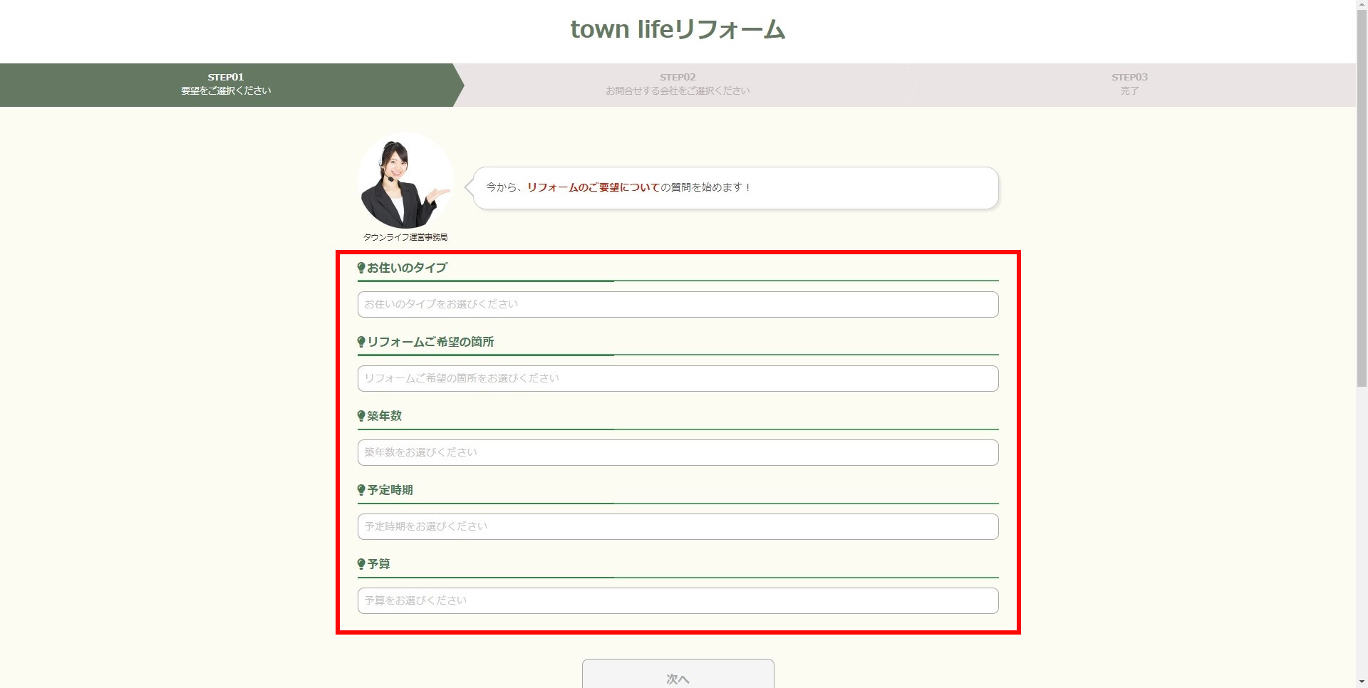 お住いのタイプ・・・戸建て/マンション/店舗・事務所 から選択