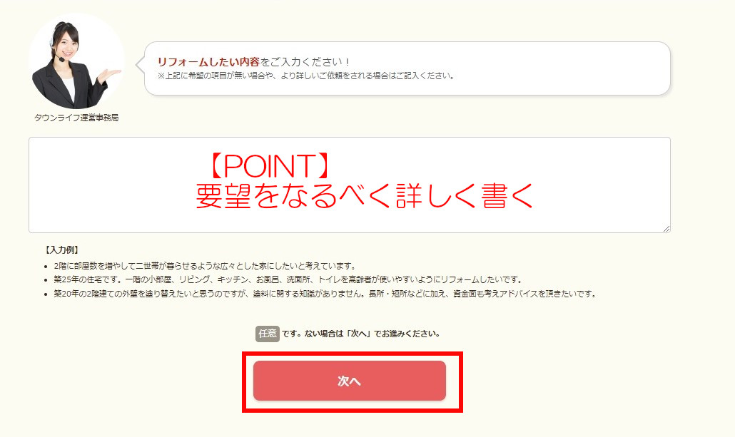リフォームをしたい内容をなるべく詳細に記載すると、より希望にあうプラン・見積もりがもらえます。