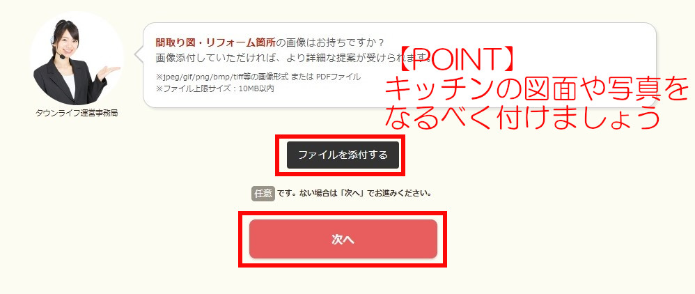 タウンライフリフォームでは見積もり依頼をする際に、リフォームしたい内容を記載する個所とキッチンの見取り図や写真などが添付できます。