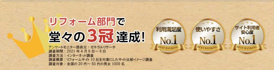 ゼネラルリサーチが2021年4月に行ったリフォームサイトのイメージ調査にて3部門でNo.1を獲得しました。
